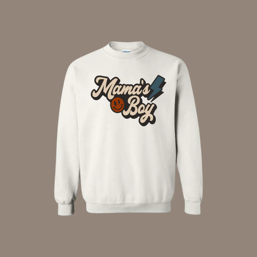 ✔️ Blanc avec texte « Mama boy » en beige sur fond noir
