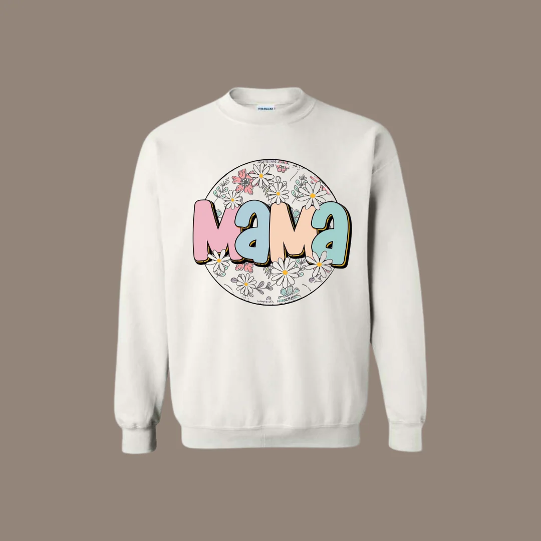 - 🌸 Inscription « MAMA » colorée + couronne florale délicate en plein centre