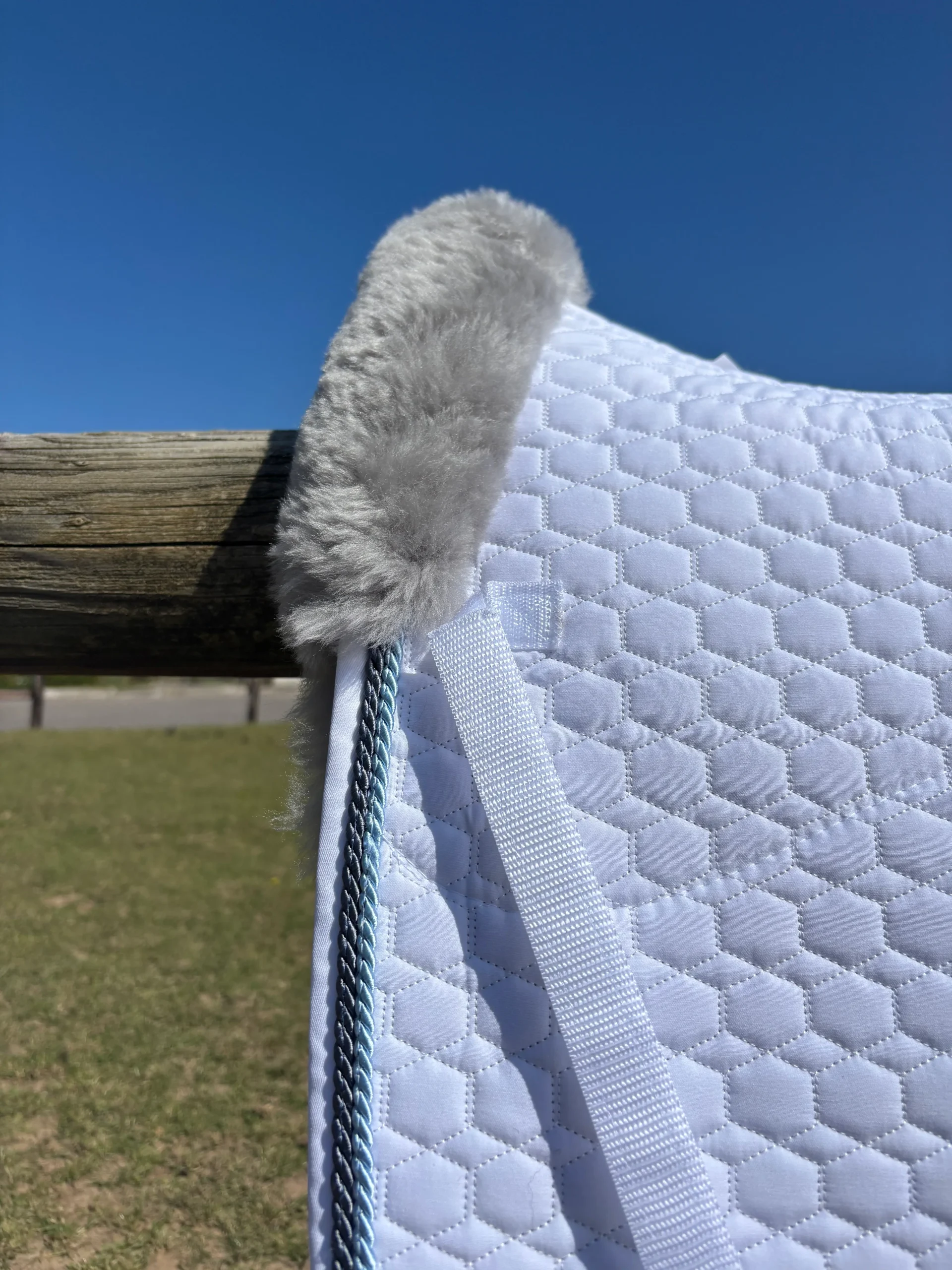 Tapis de dressage blanc, mouton gris, bord titan / bleu glacé – Mattes