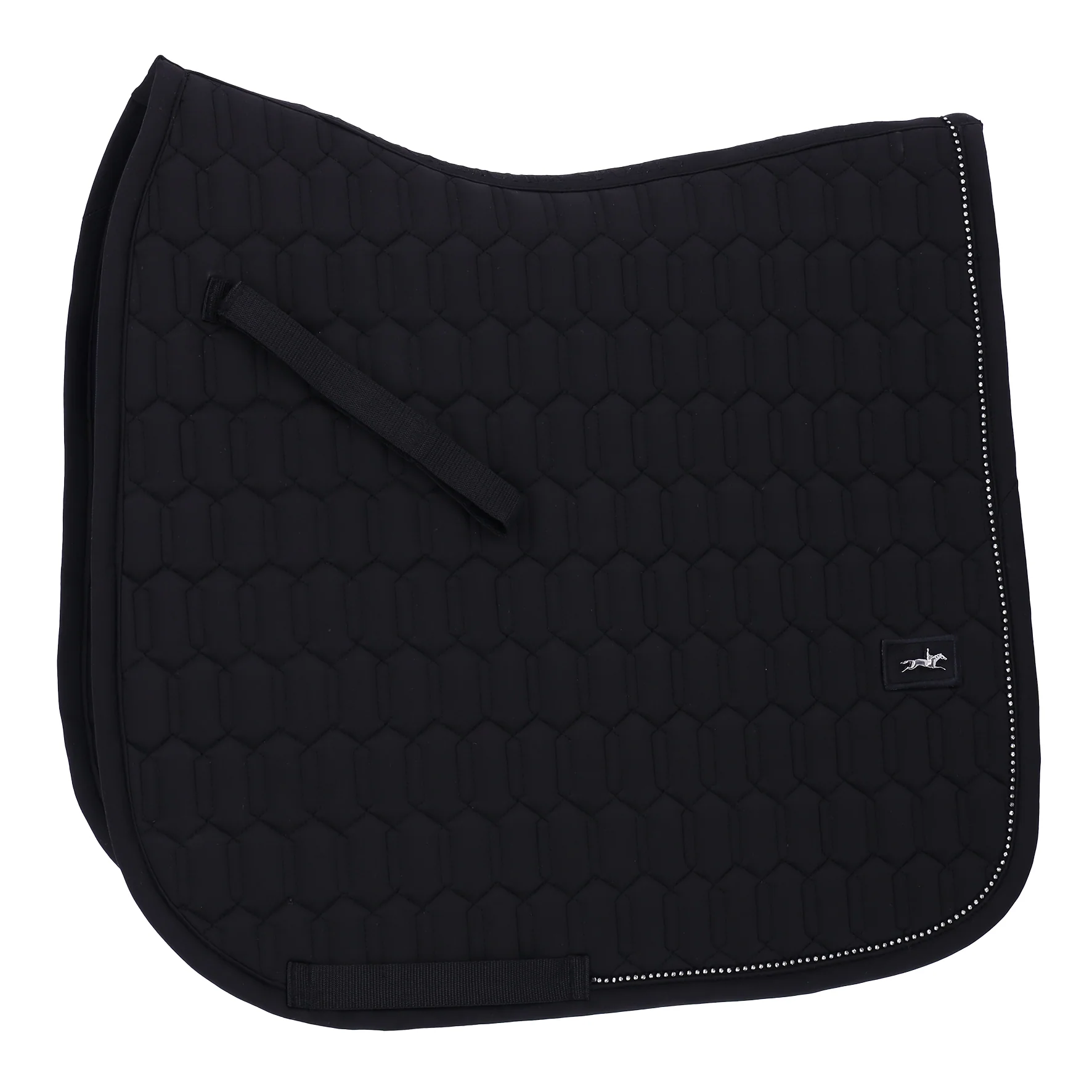 Ce tapis de selle, fabriqué dans un matériau fonctionnel de haute qualité, assure une évacuation optimale de l’humidité et sèche rapidement grâce à son envers Quick Dry, pour une sensation de confort optimale tout au long de la selle. Son excellent amorti est assuré par son rembourrage en feutre polyester, optimisant le confort et le rembourrage du cheval. Le logo cheval en métal de haute qualité et la chaîne en strass ajoutent une touche élégante et accrocheuse. Ces détails brodés le long de la colonne vertébrale confèrent au tapis une touche unique. Innovation : les sangles de sanglage sont raccourcies pour un ajustement personnalisé.