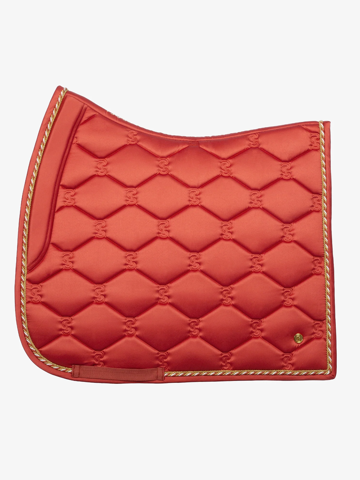 Tapis de selle de forme anatomique avec matelassage PS Signature et citation emblématique PS le long de la colonne vertébrale.