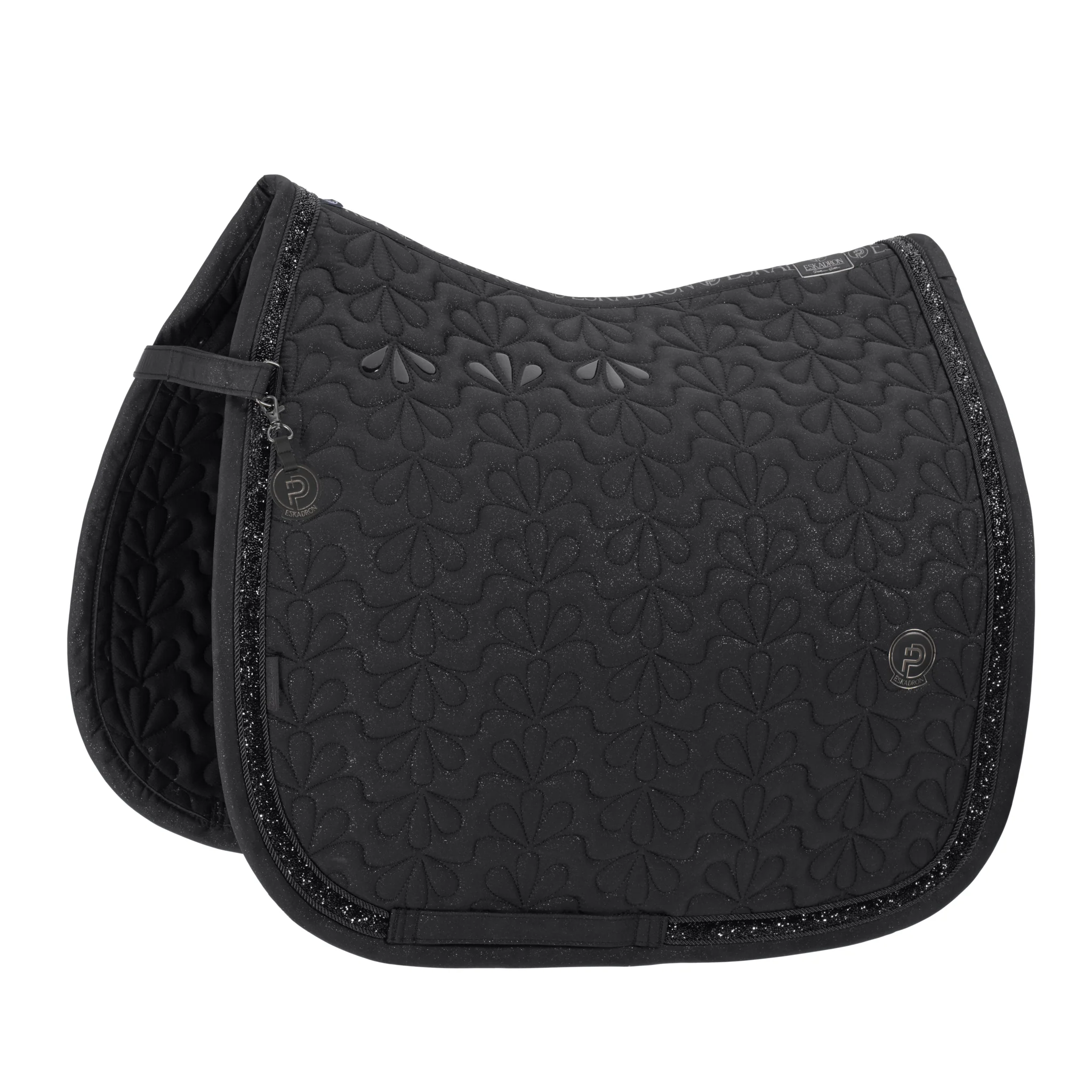 Tapis en matériau extérieur étincelant discret et frais à l’intérieur – Matelassage élaboré avec rembourrage d’épaisseur moyenne – Surfaces en silicone antidérapantes dans la zone de la selle – Emblème des deux côtés – Lettrage décoratif sur le ruban adhésif arrière – Système Innostrap pour une fixation optimale à l’avant – Passage de sangle avec triple fixation pour un positionnement exact