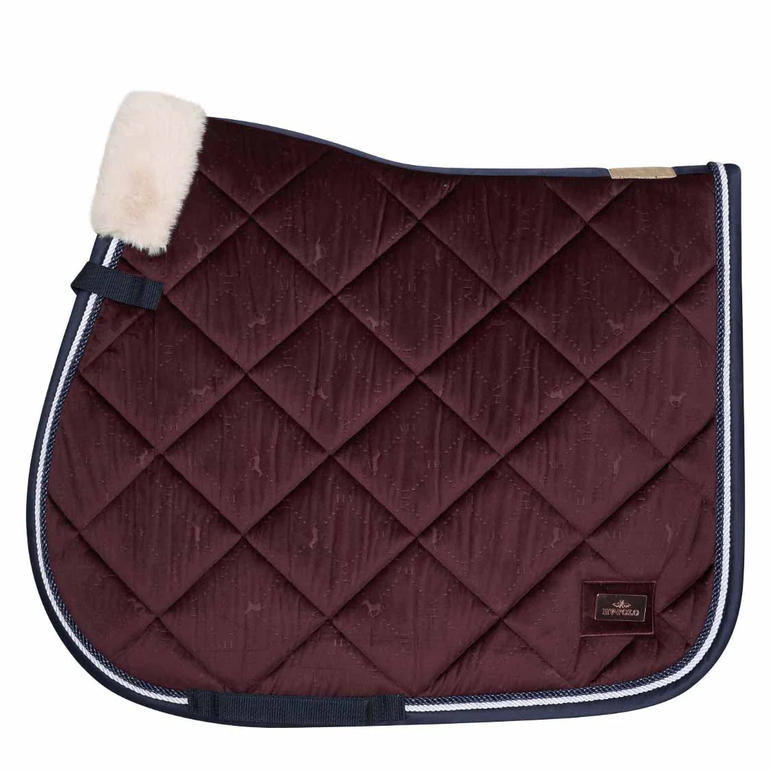 Ce tapis de selle chic de notre collection de luxe est en velours avec le logo de la marque estampé partout. Le dos et la reliure sont en satin brillant et le tapis de selle a une belle fausse fourrure sur le garrot. Il est entièrement cousu avec un matelassage carré,