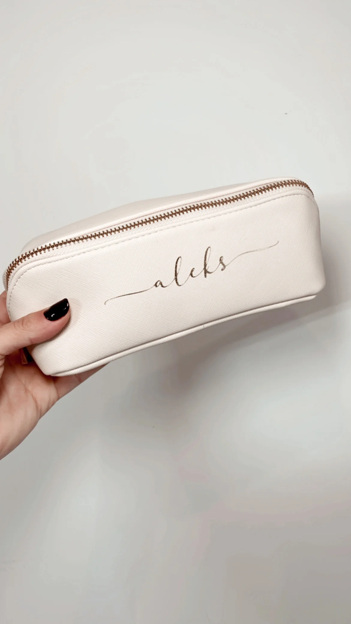 Fabriquée en simili-cuir de haute qualité, cette trousse chic et pratique se distingue par sa personnalisation délicate. Inscrivez le prénom de votre choix pour un accessoire unique, parfait pour offrir ou se faire plaisir. Son design élégant et minimaliste avec fermeture éclair robuste est idéal pour ranger maquillage, soins ou bijoux.
