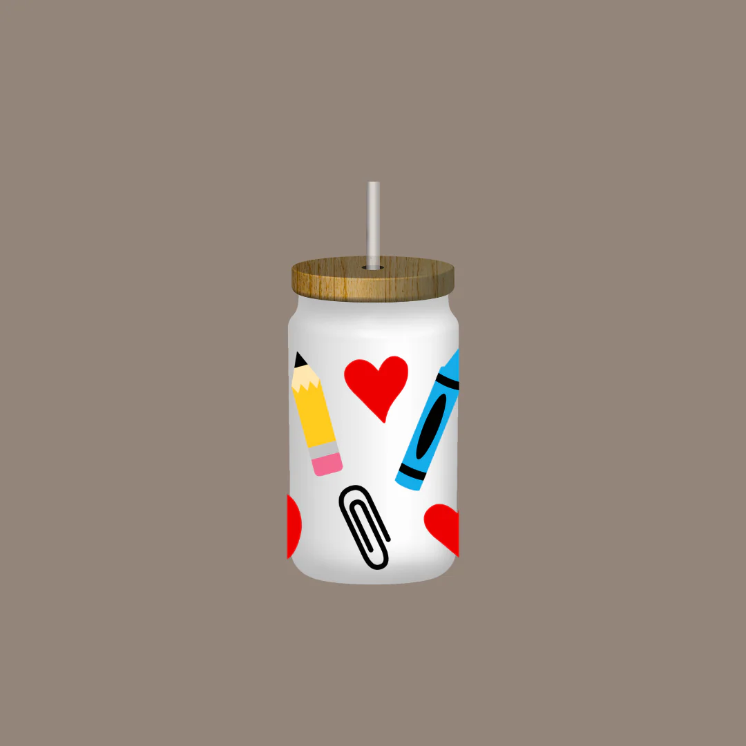 Ce verre réutilisable de 16 oz avec paille met en vedette de jolies illustrations d’articles scolaires : trombones, crayons de couleur, cœur et crayon de bois – un design vibrant et joyeux qui célèbre la passion de nos profs.