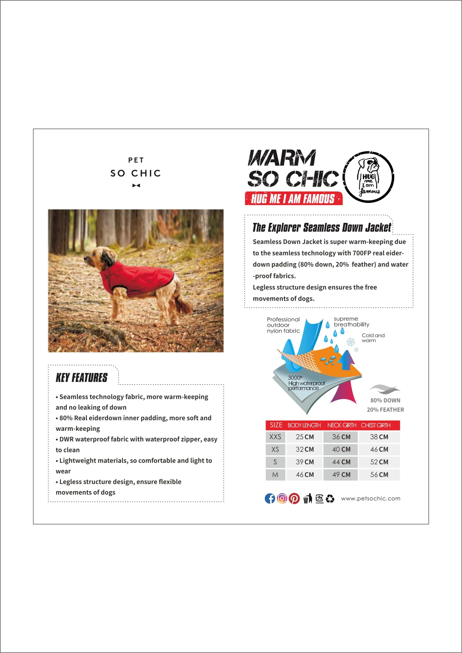 Nos vestes d’hiver se soucient également du confort de votre chien : la conception de la structure sans pattes assure sa liberté de mouvements.