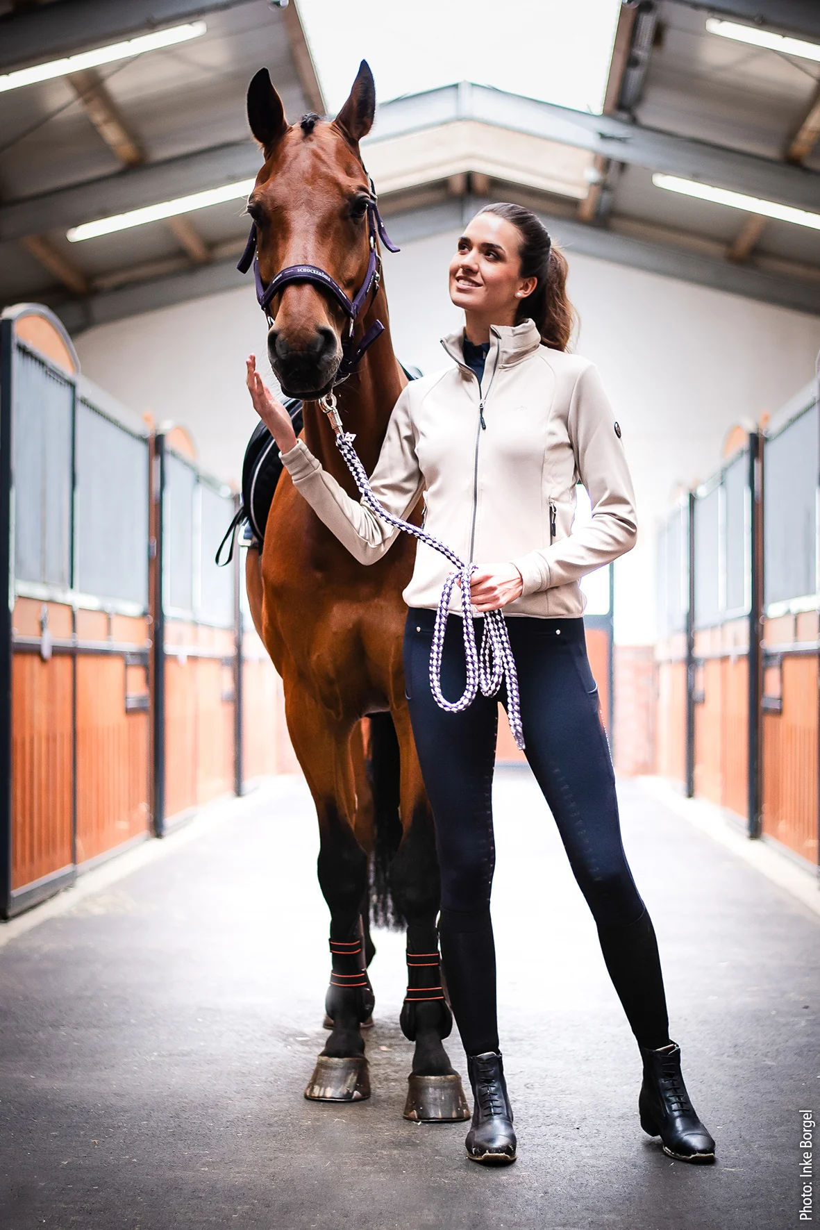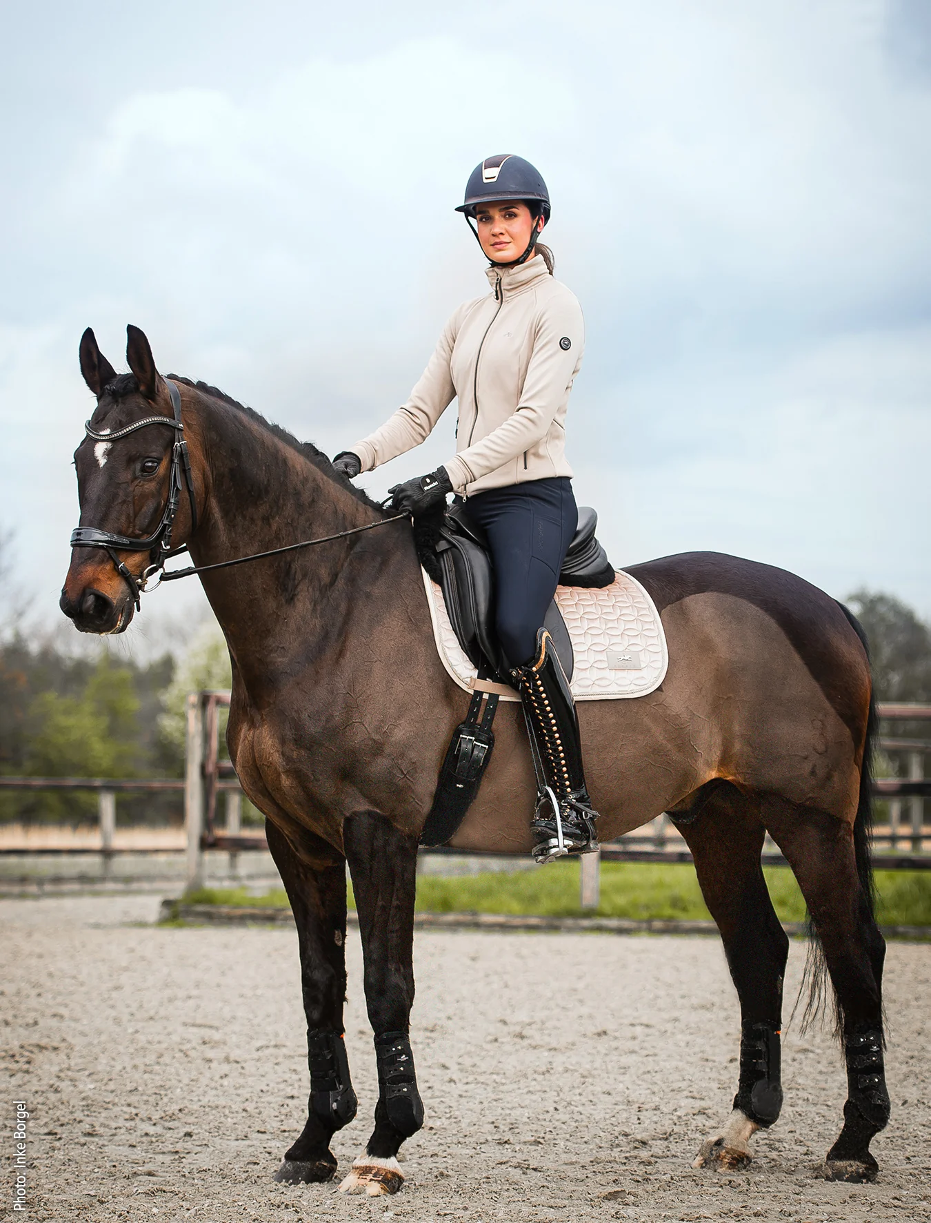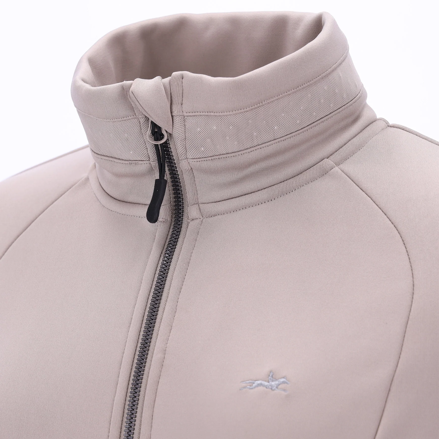 Un logo de cheval brodé est placé sur la poitrine, tandis qu’un logo en strass dans le dos offre un look personnalisé