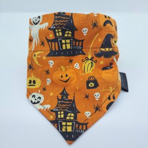 Bandana en coton orange pour chiens et chats avec un manoir hanté